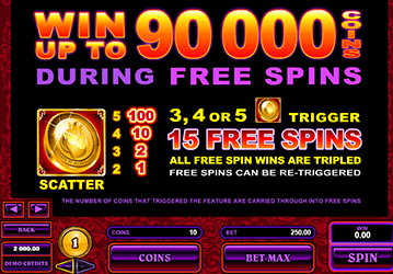 15 свободных вращений слот-машина активирует при выигрышной комбинации, состоящей из трех и более золотых монет. Во время осуществления бесплатных спинов результаты всех призовых комбинаций эмулятор увеличивает в три раза. Особо удачливым геймерам удастся продлить бонусный раунд подарочных вращений.
