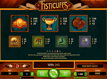 Опытным игрокам нравитсяиграть на реальные деньги с выводом в автоматы Вулканблагодаря рекордному рейтингу заведения. В коллекции официального сайта находится азартная игра Fisticuffs, предназначенная для новичков и слотхантеров. Над созданием автомата Кулачный Бой трудились программисты компании-разработчика Netent, использующие инновационную графику для отображение спортивных поединков.