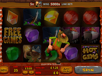 Итак, тематика аппарата связана с добычей драгоценных камней, однако это понятно из названия. На активных линиях будут появляться разнообразные символы: добытчик золота и камней, фонарь, кирка, вагонетка, драгоценные камни. Не обошлось здесь и без специальных символов. Вайлдом стала пиктограмма с соответствующей надписью «Wild», а Скаттером, который предоставляет право на 15 фриспинов – картинка, на которой написано «Free Games».