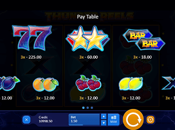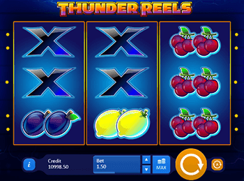 Барабаны Грома представлен в виде небольшого игрового аппарата от Playson, состоящего всего из девяти ячеек и простейшей панели управления. Благодаря вышеуказанным качествам разобраться в слот-машине Thunder Reels сможет даже начинающий геймер. Несмотря на это, перед тем как играть на деньги, не упустите возможность испытать свои силы в демосимулятора. Новая игра имеет красивую, но не излишне яркую графику. Набор барабанов расположился на фоне темно-синего неба, рассекаемого молниями, а среди участвующих в розыгрыше символов встречаются спелые лимоны, сочные сливы, сладкие вишенки, золотые звездочки, яркие семерки и таблички с надписями ”bar”.
